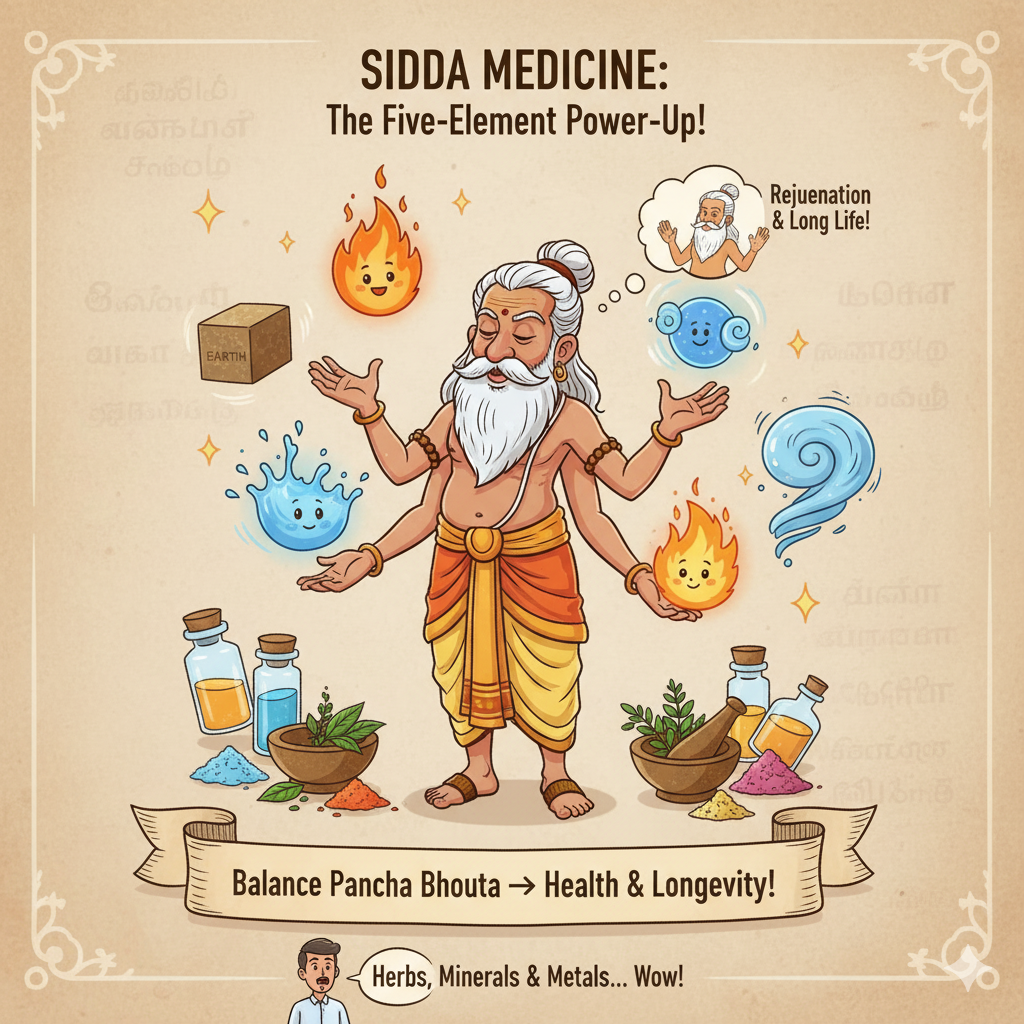 | Siddha | South India (Tamil Nadu) | Balance of five elements | Herbal-mineral drugs, rejuvenation |